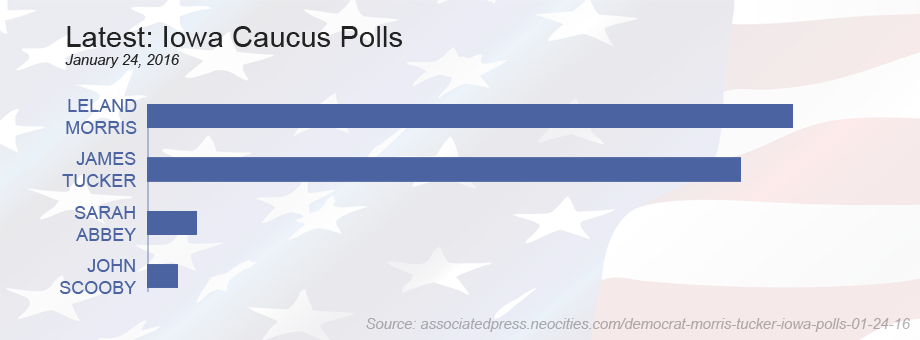 WASHINGTON (AP) — Kentucky Governor Leland Morris and business magnate James Tucker remain in a dead heat for the Democratic presidential nomination following this week's release of Ipsos polling analysis out of the Iowa caucus battlegrounds. According to the poll of 631 Americans, conducted Jan. 20-22 leading up to the caucus, Morris leads Tucker 47 percent to 44 percent among Democratic voters. The poll has a credibility interval of 4 percentage points. Morris had been leading the polls by a 30 percent margin at the beginning of the year, but Tucker has narrowed that lead considerably over the past several weeks. Experts say that Morris is still expected to win in Iowa, but the race in New Hampshire is far too close to call. Tucker has extremely strong support in New England as a Massachusetts native, and analysts expect that to be a driving force in the polls. The two rivals clashed on Thursday night in their first one-on-one debate, reflecting the tightness of the race. The other candidates, including Sarah Abbey and John Scooby, are far behind at 3 and 1 percent of the polls, respectively. It's expected that Scooby will concede after Iowa. On the Republican side, Donald Trump continued to lead the field with 40 percent support in the polls. Senator Ted Cruz of Texas followed with 16 percent and Senator Marco Rubio of Florida came in third with 13 percent.